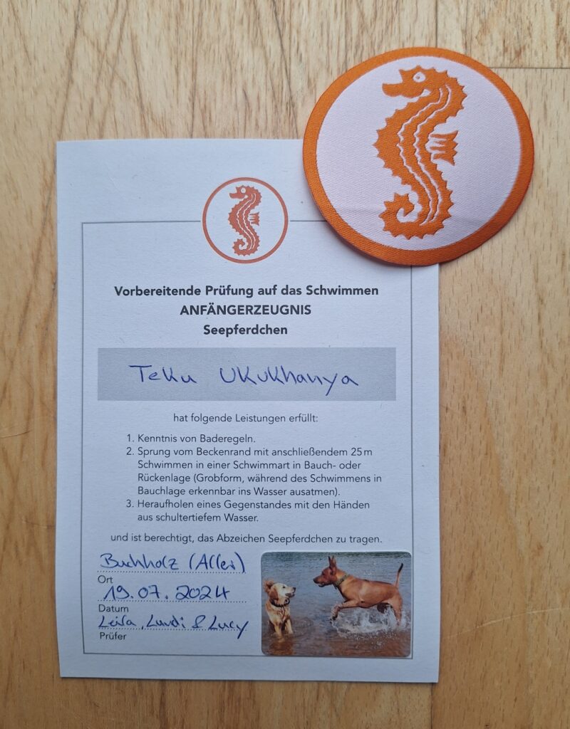 Tjaaaha, jetzt denkt ihr wahrscheinlich: Häää, Ridgeback - Schwimmen - Wasser??? Aber ICH hab mich getraut! Jawohl! Ich bin geschwommen! So richtig mit den Füßen nicht mehr auf dem Boden und so! Ha! Guckt, hier der Beweis, meine Urkunde: