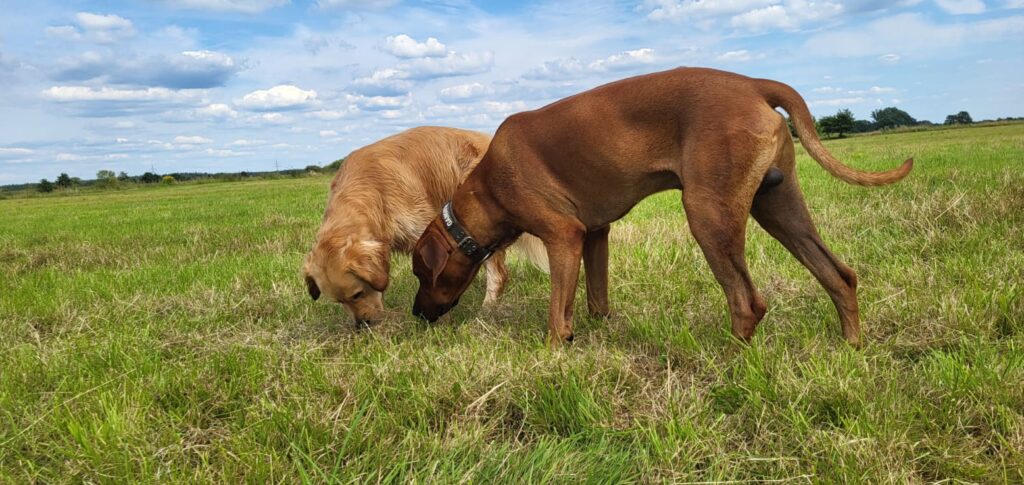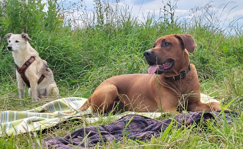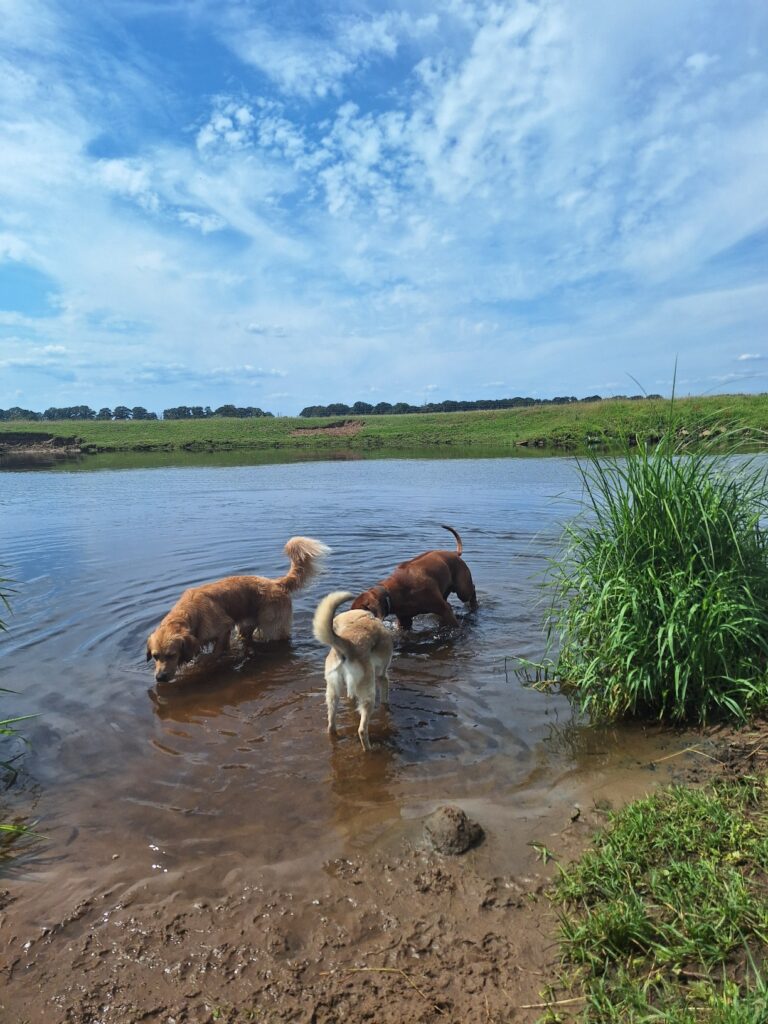 Okay, ich gebe zu, ich habe mich ein bisschen überreden lassen ;-) Wir haben nämlich mit Lundis Frauchen einen Ausflug nach Buchholz an der Aller gemacht und da kann man ja eigentlich ziemlich gut ins Wasser gehen und dann hatte die liebe L. auch noch so Leckerlis dabei! Enten-Leckerlis - klar, na logisch Ente, was soll man auch sonst mit ins Wasser nehmen, also vielleicht noch Fisch, aber die wären ja dann so mehr unten im Wasser drin und da wollte ich ja nicht hin ... jedenfalls ist L. dann ins Wasser gegangen und der Lundi auch und dann haben sie mich so ein bisschen gelockt und schwups war ich irgendwie plötzlich so weit drin, dass der Boden weg war! Hui hui hui, das war ganz schön aufregend! Eventuell musste man mich auch kurz dran erinnern, dass man den Kopf am Besten über Wasser halten muss wenn man schwimmen will ... ;-) Aber hey, ich übe noch, ist halt noch kein Meisterschwimmerridgeback vom Himmel gefallen ;-)