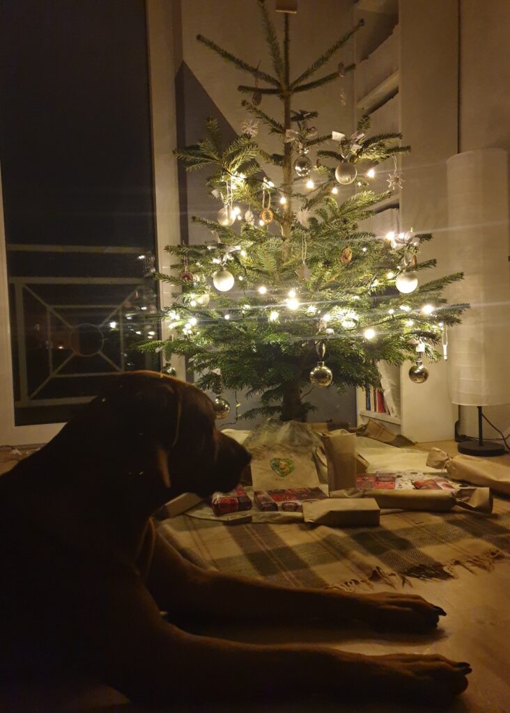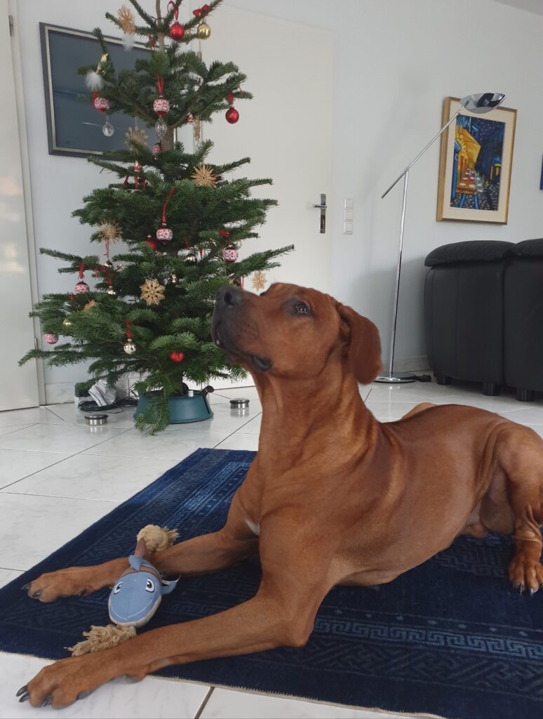 Erstmal dieses "Weihnachten". Das fand ich ja letztes Jahr schon ganz cool so mit einem eigenen Baum im Wohnzimmer und den ganzen Geschenken und so! Dieses Jahr war es sehr entspannt, wir haben es uns ganz viel gemütlich gemacht, ich konnte mit meinen neuen Stofftieren rumtoben und wir haben Herrchens Eltern besucht. Ich habe ja so den Verdacht, dass es hier die ganze Zeit überall voll das leckere Essen gab und ich ständig nur mit so nem Kauknochen-Krams abgespeist wurde ... Beweise hab ich aber leider keine ;-) Und jaaaa, naaa gut, so ganz doof sind ja diese richtig großen Kaudinger auch nicht :-)