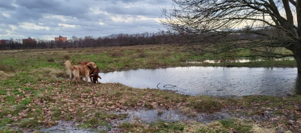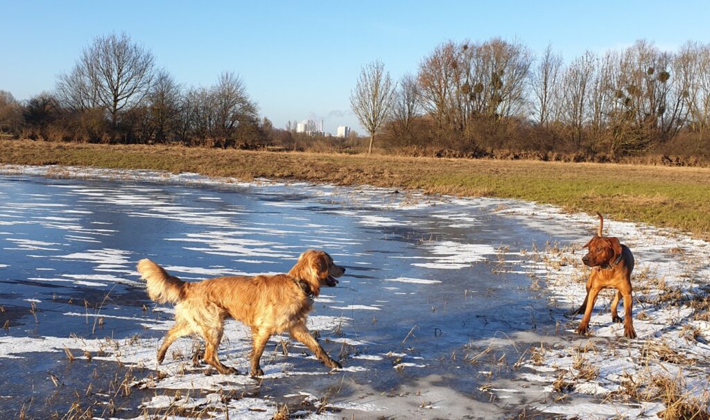 Immerhin steht die Hundewiese nicht mehr unter Wasser und ich darf da wieder mit Lundi toben! :-) Da sind nur noch gefrorene Pfützen, aber die sind echt toll, da können wir nämlich Eislaufen und Eis...fressen ;-)