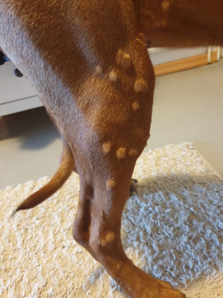 Letzten Samstag war ich morgens ganz normal mit Frauchen draußen, aber nach dem nach Hause kommen guckt die mich plötzlich ganz komisch an, läuft dann hektisch zu Herrchen und erzählt irgendwas von Quaddeln, die ich angeblich am ganzen Körper habe. Herrchen war auch direkt ganz besorgt, ich durfte mich dann unter eine dicke Decke kuscheln und dann sind die wohl wieder weg gegangen. Puh, "Glück gehabt" dachten wir alle, vielleicht nur kurz auf irgendwas allergisch reagiert. Tja ... bis die Quaddeln dann wieder da waren. Mittags, abends, morgens ... immer dann, wenn ich nach draußen in die Kälte gegangen bin!! Könnt ihr euch das vorstellen? Das war echt krass! Hier, so sah das aus: