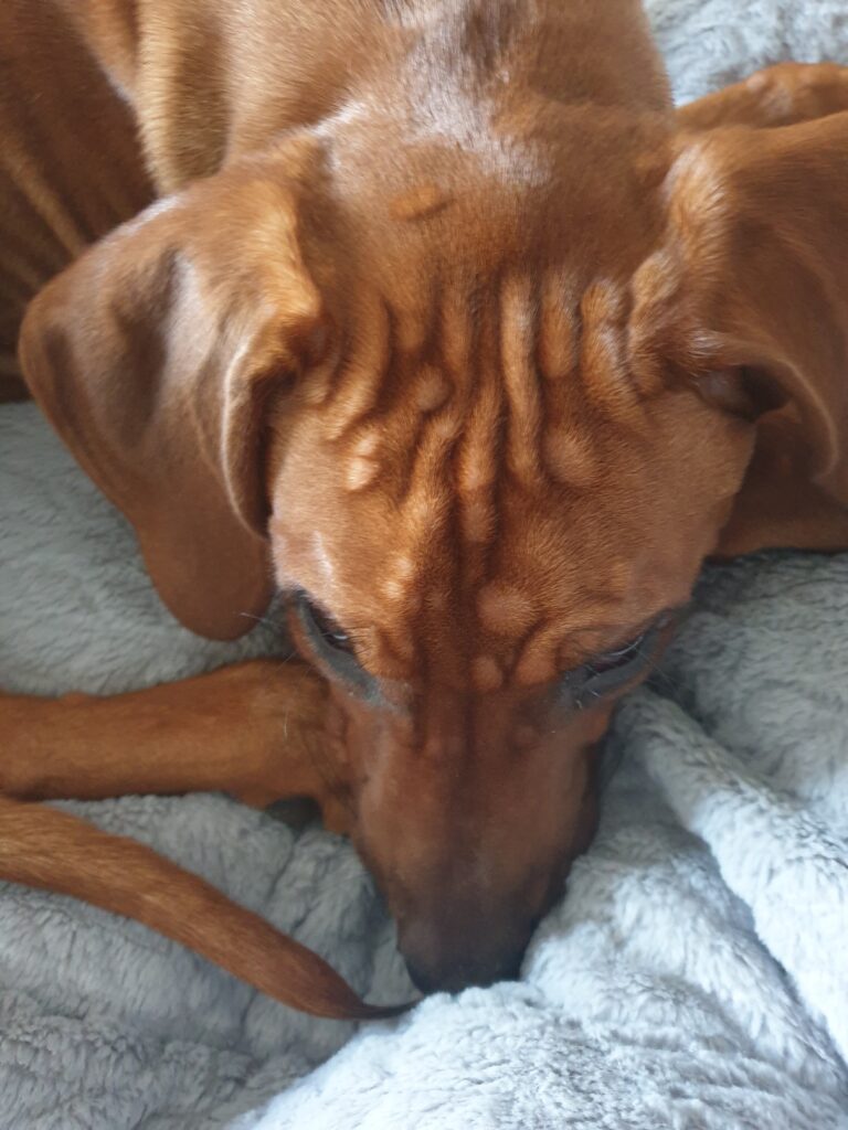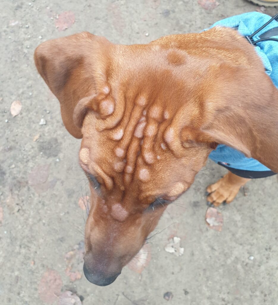 Habt ihr sowas schon mal gesehen? Also wir nicht! Unsere Tierärztin auch nicht, da waren wir dann nämlich am Montag. Die konnte uns aber nicht helfen und deshalb sind Frauchen und Herrchen dann am Dienstag mit mir in die Kleintierklinik gefahren. Da hatten wir einen Termin bei einer ganz netten Dermatologin und die konnte dann das Rätsel lösen: Ich habe eine "Kälteurtikaria" - ja genau, schon allein das Wort ist gruselig, oder? Das ist wohl eine Nesselsucht, die durch Kälte ausgelöst wird! Verrückt oder? Anscheinend gibt es noch mehr Ridgebacks, die damit Probleme haben - aber warum das passiert und ob und wann das wieder weg geht, das kann keiner sagen! Kann ja wohl nicht wahr sein! Dabei möchte ich mir doch so gerne dieses hübsch gefrorene Gras draußen anschauen und mit Frauchen und Herrchen coole Winterabenteuer erleben ... und jetzt darf ich immer nur ganz kurz raus, damit ich nicht direkt wieder so viele von diesen Quaddel-Dingern kriege. Blöd! Man ey! Immerhin haben wir aber Medikamente bekommen, die helfen sollen. Die einen muss ich jetzt erstmal jeden Tag nehmen, die anderen sind für Notfälle: