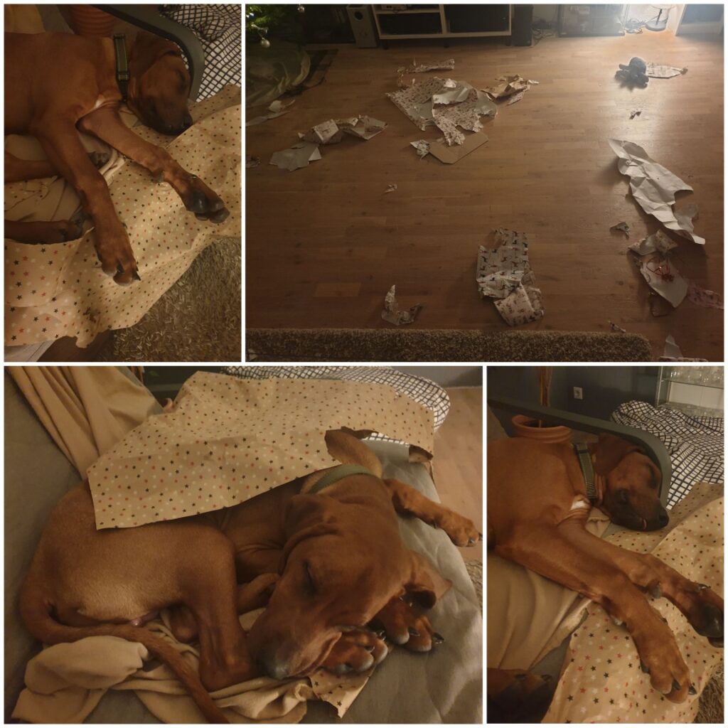 Und in dem Geschenkpapier, da waren sogar Geschenke drin! Also nicht, dass das jetzt wichtiger wäre, als das Geschenkpapier selbst, aber ich wollte es trotzdem mal erzählen. So ein kleiner blauer Oktopus zum Beispiel, mit dem kann man voll gut spielen weil diese ganzen Arme so schön wackeln. Und dann irgend so ein grünes Dings das ich wohl immer finden und wiederbringen soll und dann ist da Futter drin - hab ich noch nicht so ganz genau verstanden, aber Futter ist ja erst mal gut! :-) Und überhaupt gab es noch ganz viele andere leckere Sachen und ich glaube, dass Frauchen & Herrchen auch irgendwo ein zweites Spielzeug vor mir verstecken ... ich werde berichten, wenn ich das genauer ermittelt habe! Frauchen meinte, sie hat auch so "Backmatten" und ein passendes Buch dazu geschenkt bekommen - fragt mich nicht, aber das muss irgendwas mit Leckerlis für mich zu tun haben, ich werde das weiter beobachten!!