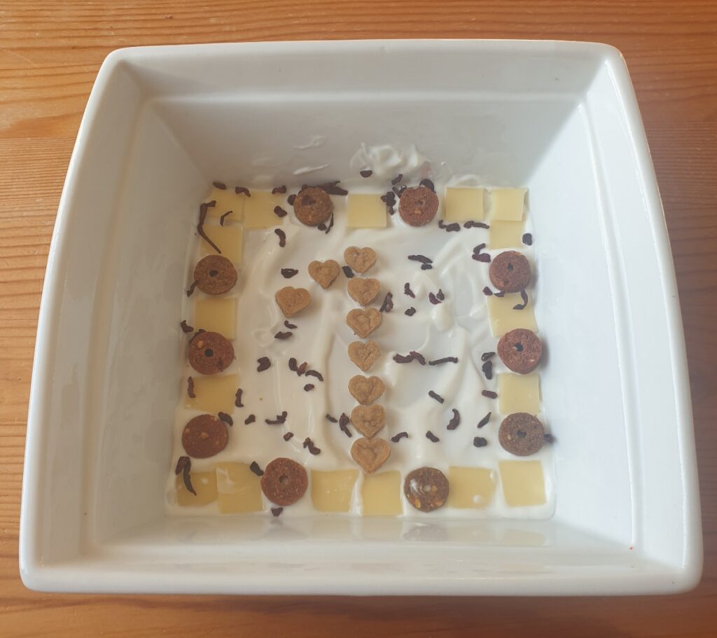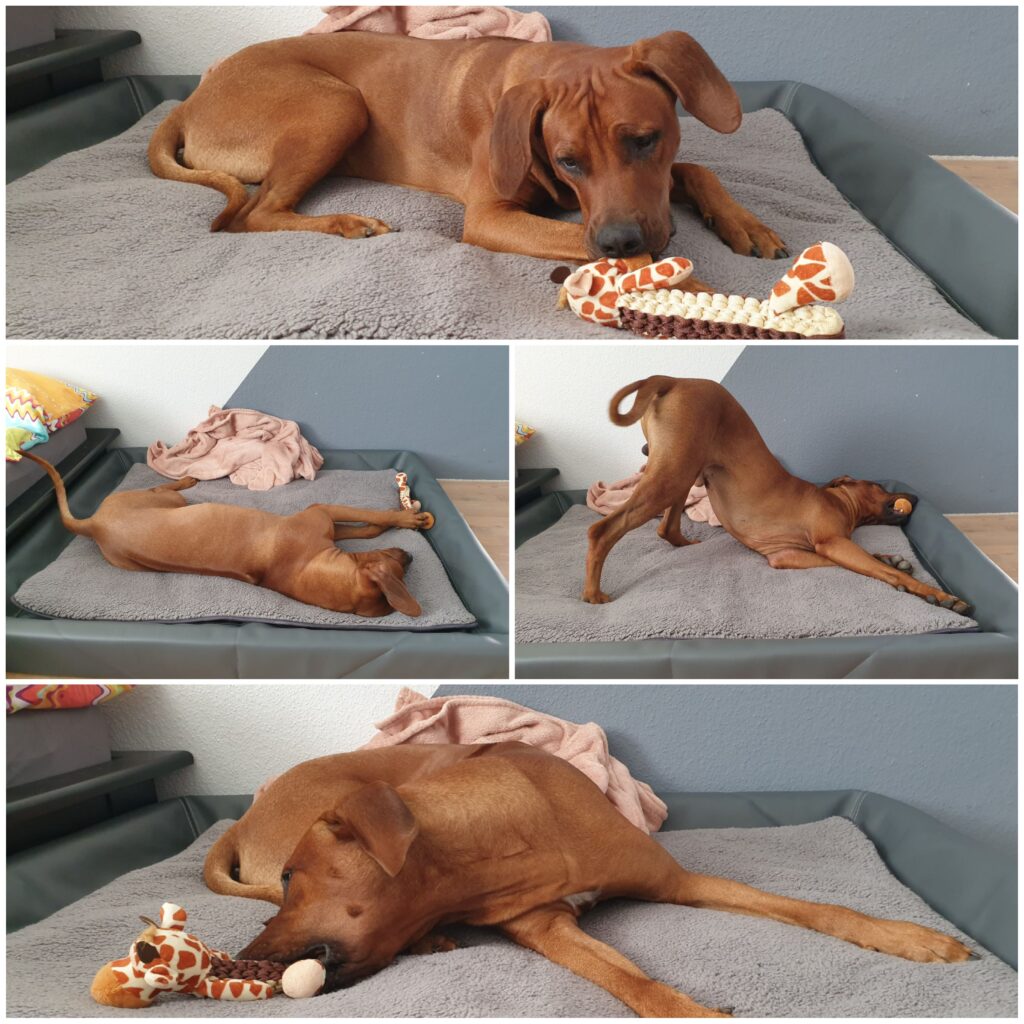 Danach gab es Geschenke von Frauchen und Herrchen nämlich ein neues Bettchen und eine Spieli-Giraffe: